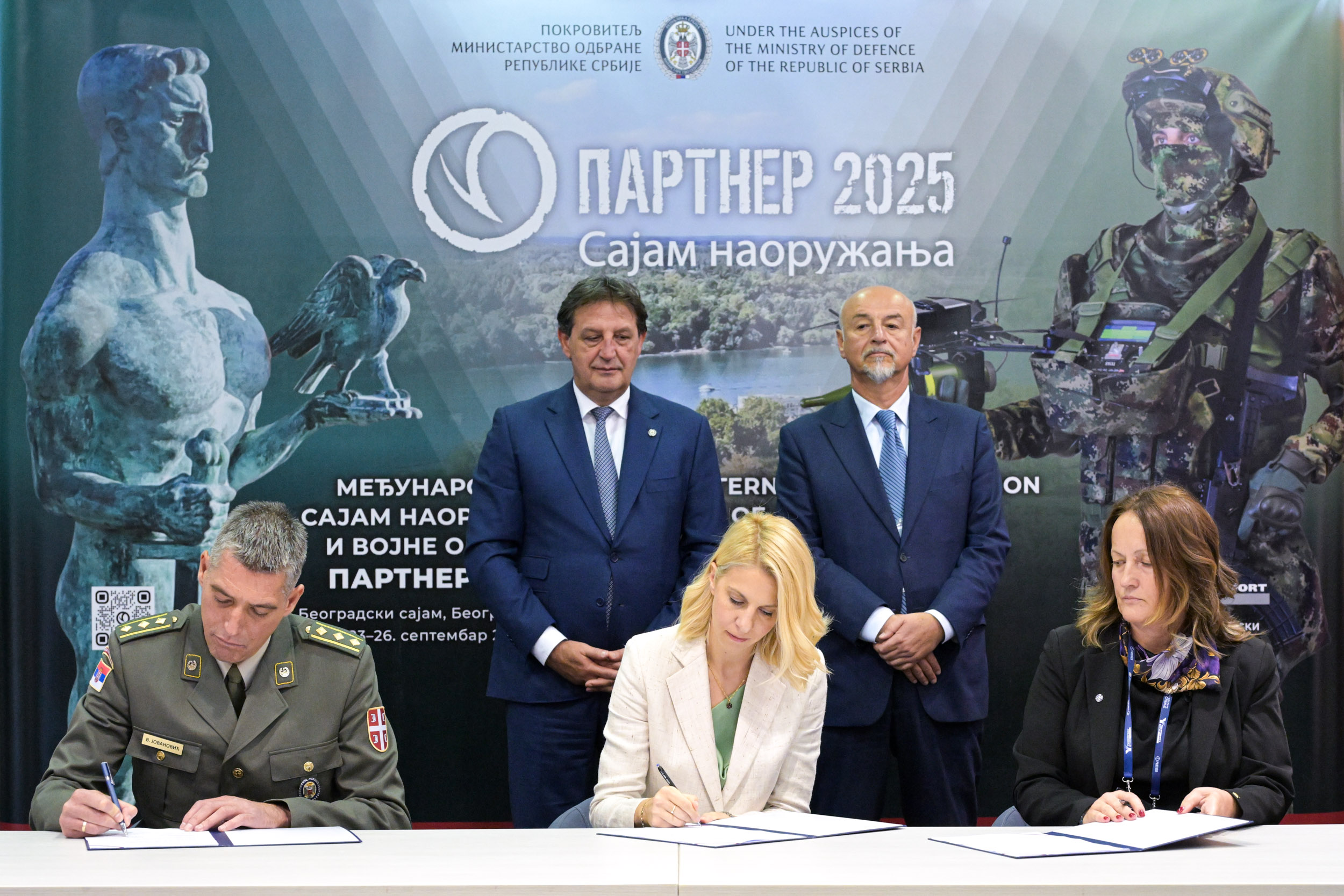 Министар одбране Братислав Гашић присуствовао је данас, у оквиру 12. Међународног сајма наоружања и војне опреме „Партнер 2025“, потписивању уговора трећег инвестиционог циклуса улагања у производне капацитете привредних друштва из групације Одбрамбена индустрија Србије, као и уговора за опремање савременим наоружањем и војном опремом организационих целина Министарства одбране и Војске Србије.